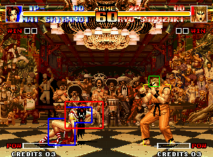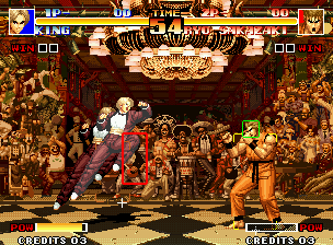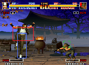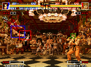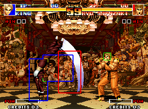 2011-02-28 判定画像 KOF94 攻略 KOF 判定、ヒットボックス データ ■京 ・強鬼焼き 食らい判定を攻撃判定で覆っており、なおかつめくりにも対応。 ■舞 ・屈C この判定の強さはガチ。づねさんの言われる通り対空にも使えそう。 ・弱ムササビの舞 斜め下に判定強い。 ■キング ・強トラップショット 食らい判定より攻撃判定が少し前に出ている。相打ち狙いの他、足払い刈りにも使えそう。 ・超必殺技 突進しはじめでも安心の全身無敵
